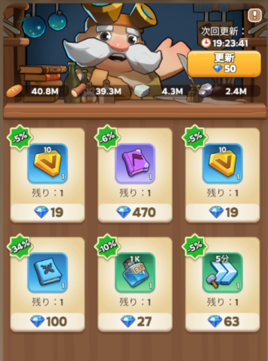 基本的に最低でも等価交換になります。ただ、割引になっているものが複数出現するので、最終的にトータルではお得になります。さらに通常ダイヤやコインで購入するはずの加速アイテムや、転移のアイテムが稀にくるので、必ず3更新分は交換してしまうのが推奨。